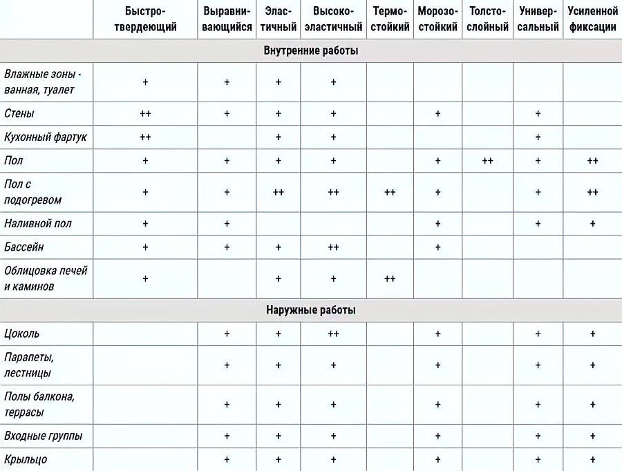 Температурный режим в каждом регионе России свой, это значительно влияет на вид применяемого клея и форму его выпуска. Более того, в комнате или на наружной поверхности, где будет клеиться плитка, может быть различный уровень влажности, а это также важнейший показатель, без которого невозможна длительная эксплуатация слоя керамической плитки. В связи с этим существует целый ряд специализированных добавок, делающих состав устойчивым к жаре или морозу, добавляющих пластичности или иных расширенных функций. Чтобы понять, какие свойства нужны именно для вашего случая, ознакомьтесь с приложенной ниже таблицей.