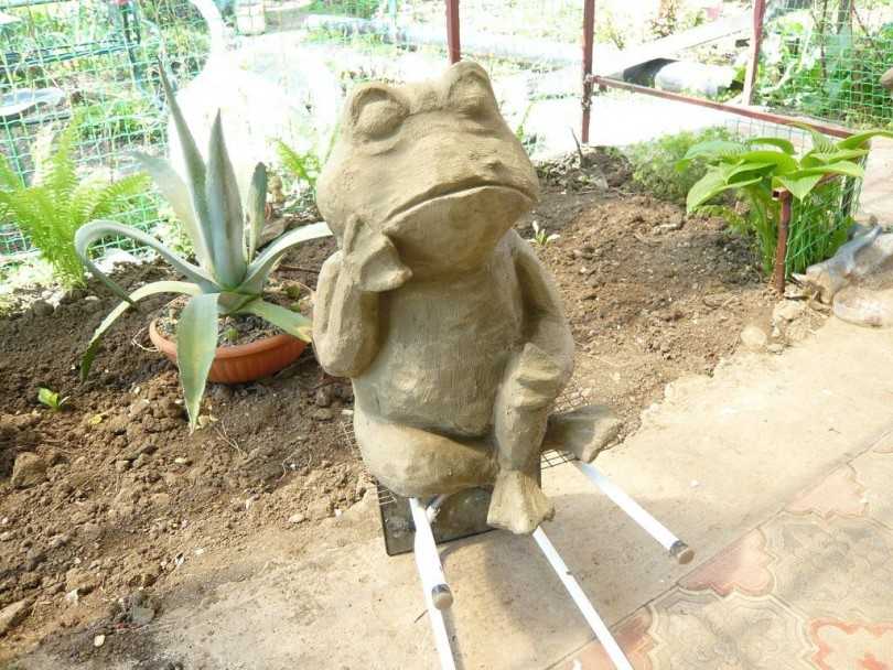 Украсить свой сад можно и поделками из бетона. Делаем обычный цементный раствор (1 часть цемента, 3 части песка), сооружаем из подручных материалов каркас намеченной фигуры, и начинаем потихоньку налепливать на него раствор. Самым главным достоинством такого способа является возможность придать изваянию любые формы.