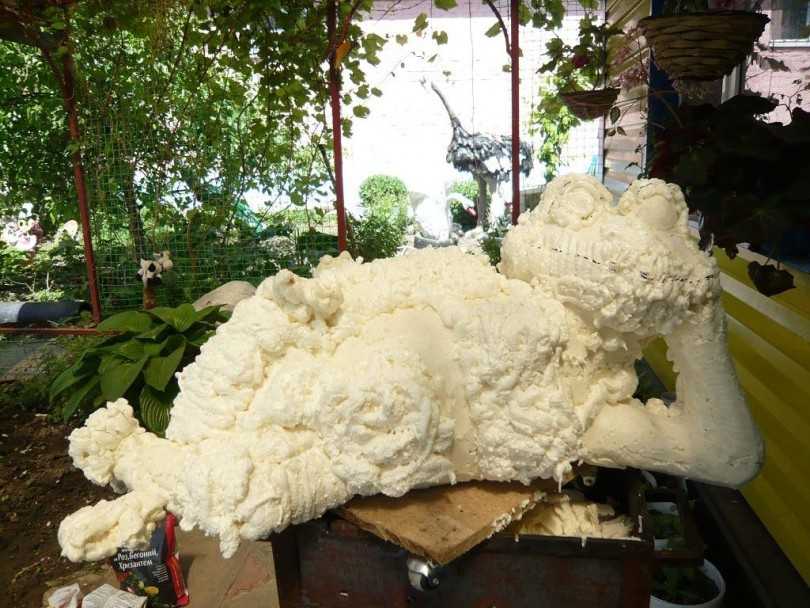 Если у вас после ремонта осталась монтажная пена, вы просто обязаны потратить ее на изготовления скульптуры для сада. Принцип работы такой же, как и с бетоном – сооружаем каркас и обволакиваем его в несколько слоев пеной. Особенность работы с этим материалом заключается в том, что каркас нужно делать тяжелым или отягощать, например, засыпать в полости песок или использовать для каркаса пластиковую бутылку с песком.