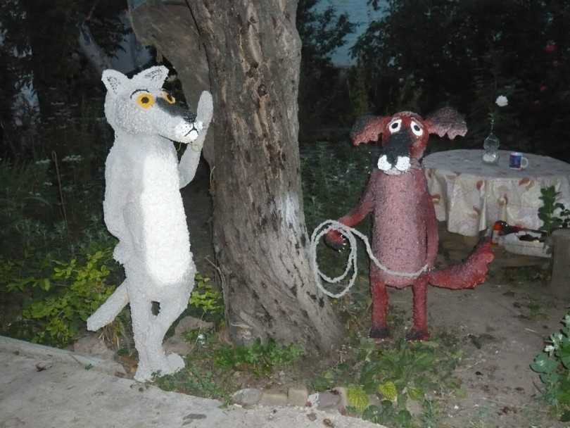 Для более крупных и объемных фигур каркасом может служить любой подручный материал, но, естественно, пены понадобится больше и каркас должен быть надежнее. Тут главное – не бояться экспериментировать. Во время работы, после нанесения пены нужно тщательно просушить фигуру, прежде чем наносить краску. Сушить их нужно не менее недели, а потом, желательно ставить в тени. Тогда фигурки не будут трескаться. А после зимы их нужно обновлять масляной краской. Зато ваш дворик будет просто сказочным.