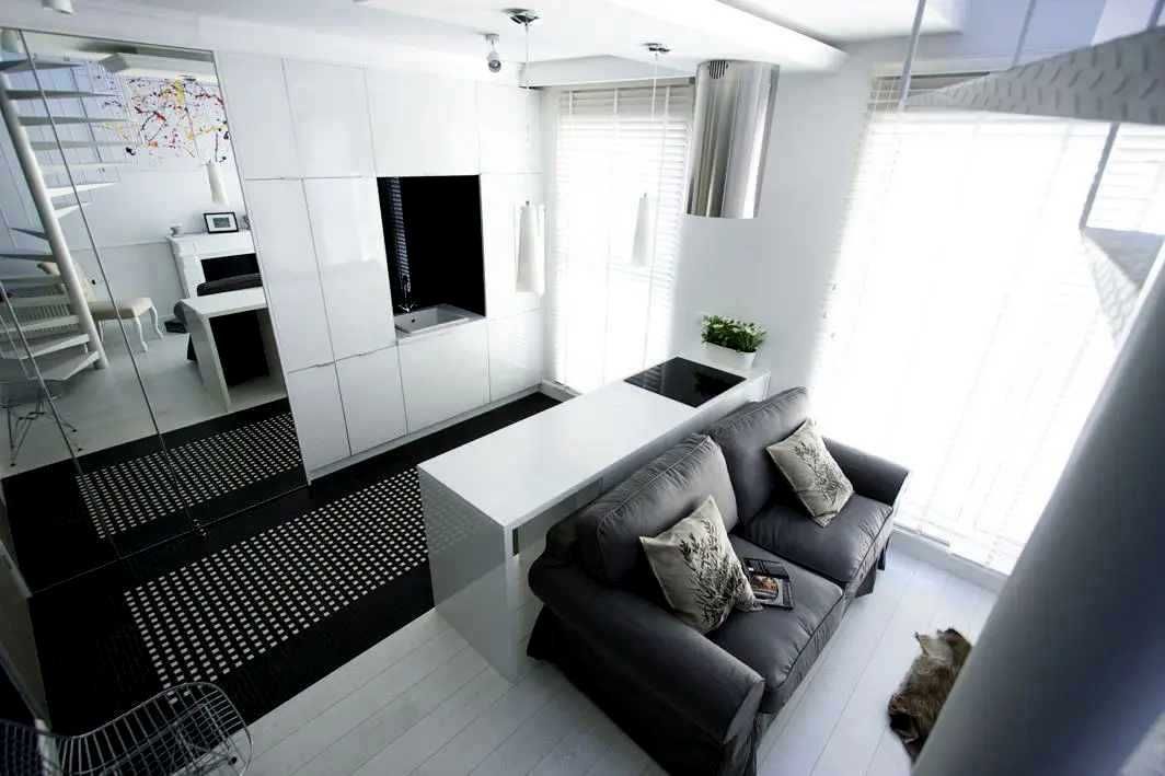 Зонирование пола (ч/б пол). В комнате, объединяющей гостиную и кухню использовано только два цвета в оформлении. Сразу бросается в глаза двухцветный пол: под кухонной зоной кафельная плитка чёрная, а под гостиной белая.