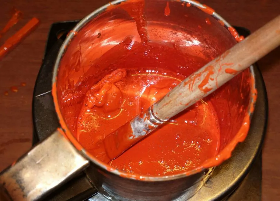 - Приготовление сурика для окрашивания. При высокой вязкости в суриковую краску добавляют уайт-спирит, сольвент, скипидар до получения рабочего состава.
