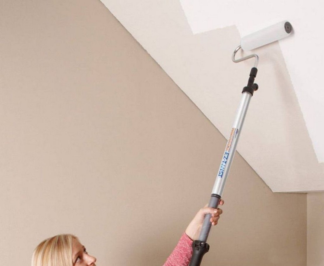 Потолок следует окрашивать по определенным правилам. Прежде всего, следует озаботиться приобретением действительно качественного валика, грошовая экономия тут совершенно неуместна, так как дешевый инструмент способен испортить всю работу.