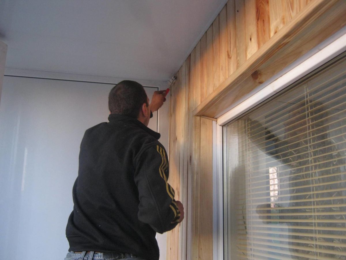 Отделка балконов и лоджий этим способом имеет явное преимущество – гидроизоляционный материал, как и теплоизолятор, предназначенный для утепления балкона, укладывают непосредственно в межреечное пространство. Далее приступают непосредственно к обшивке: установке и фиксации вагонки:
