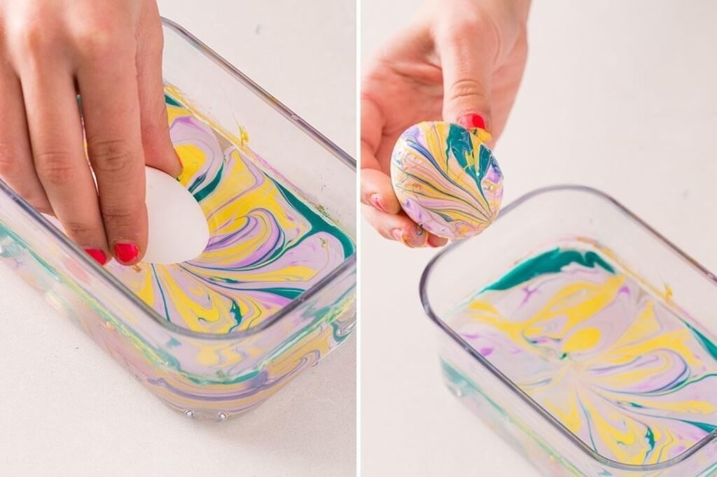 2. Любите заниматься декором? Возьмите небольшую емкость, налейте в нее воды, а после залейте разными цветами лака. Теперь можно окунуть любой предмет и он окрасится в эти цвета. Технология — марморирование.