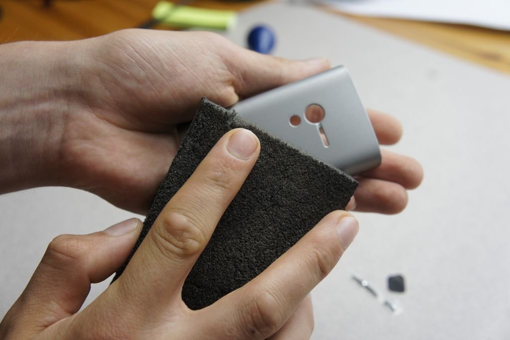Шаг 2. Крышку телефона обязательно протрите от пыли и грязи. Если задняя панель имеет глянцевую поверхность, зашкурьте ее наждачной бумагой. Так, краска лучше схватится. Зашкуривайте аккуратно, стараясь не оставлять глубоких царапин. После работы с наждачной бумагой обязательно протрите панель тряпкой.
