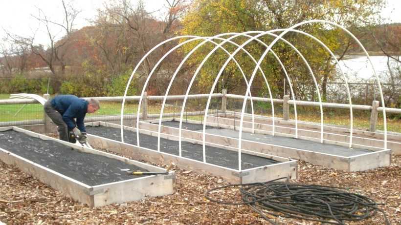 Условие одно – конструкция должна быть небольшой (4-8 кв.м), иначе самодельный каркас не выдержит нагрузки от осадков, веса защитной мембраны и растений, если они вьются.