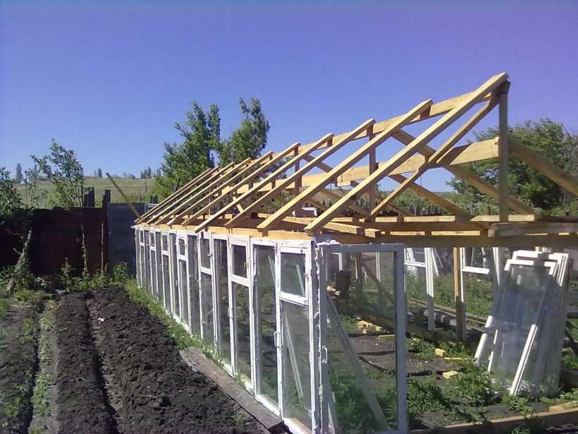 Однако при желании реализовать проект теплицы своими руками, для несущего каркаса можно применить изношенные оконные створки и рамы, профилированный брус с большим сечением или крупные ветви.