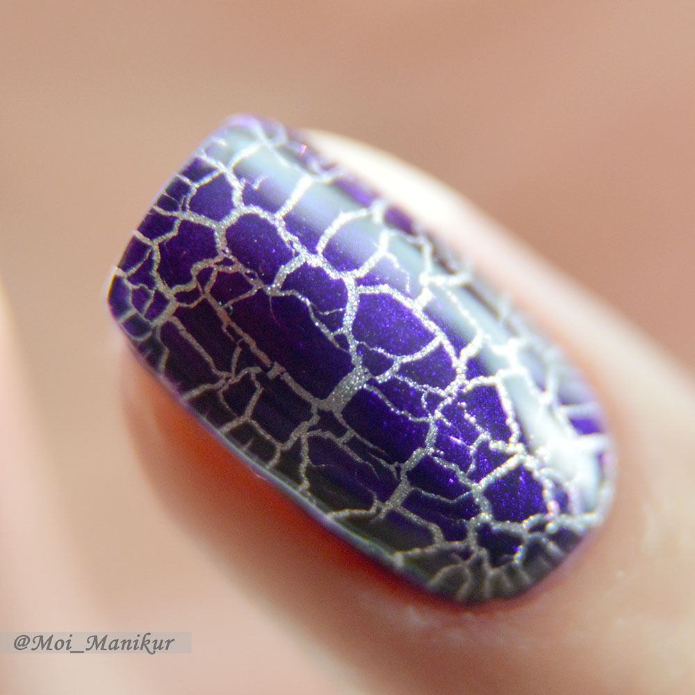 Цветов для эффекта кракелюр больше – их 36. У меня это Баклажан – яркий и насыщенный сине-фиолетовый оттенок без блесток и перламутра. При нанесении он немного просвечивает и кажется желейным, но при высыхании это исчезает, видимо, за счет сжатия гель-лака. В цветовом сочетании с подложкой он смотрится шикарно! Впрочем, все цвета подложек TNL сделаны таким образом, что будут сочетаться практически с любым цветом кракелюра.