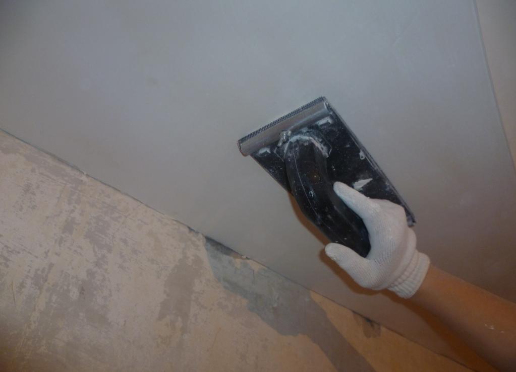 Сильного надавливания не нужно, важно лишь сгладить возможные шероховатости. После всего потолок нужно снова прогрунтовать, просушить и можно красить