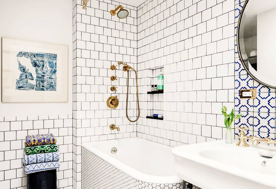 - Частичное. В данном случае используют лишь окрашивание некоторых элементов. Например, если плитка однотонная, то основной цвет оставляют, добавляя другой оттенок. В итоге можно получить шахматный рисунок или полосы на стене.