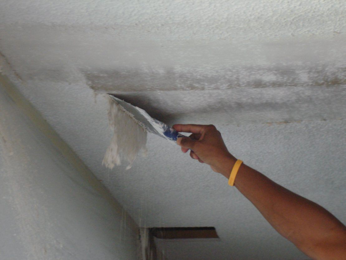 Это грязный и неприятный этап работы. Перед тем, как выровнять поверхность под покраску, его нужно почистить до бетонного основания. Для этой работы понадобится прочный металлический скребок (можно старый шпатель), острый топорик и щетка. При чистке желательно защитить руки перчатками, а органы дыхания – респиратором. Работу нужно вести со строительных лесов подходящей высоты (чтобы не упиралась голова, свободно можно было доставать до потолка).